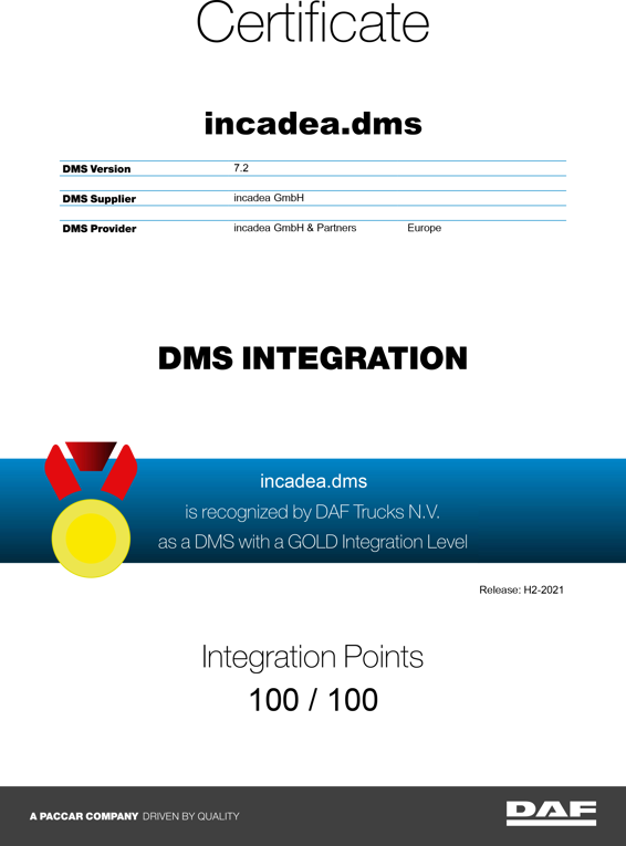We are proud to announce that incadea.dms has once again received 100 out of 100 points. DAF Trucks NV thereby acknowledges that incadea offers a high qualitative DMS meeting DAF standards with good support. Therefore incadea.dms is highly recommended for all DAF dealers.